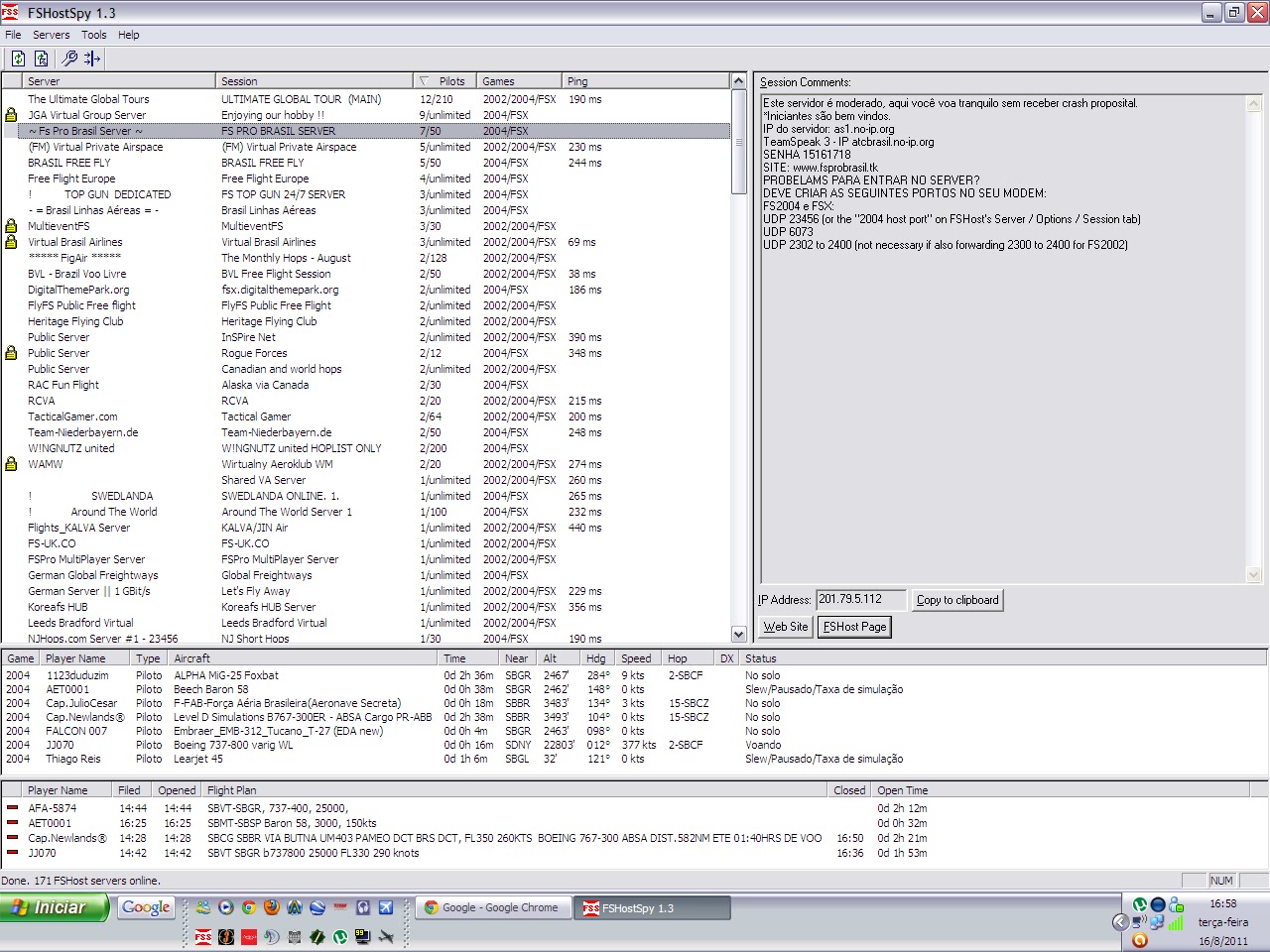 Meu primeiro post aqui no blog é um add-on ótimo pra quem gosta de voar online, mas não em rede de controle como IVAO ou VATSIM. É o FSHostSpy 1.3, é só abrir ele que ele procura os servers online disponíveis para FS2002/2004/X, abaixo da lista de servers tem uma lista de pilotos online por cada server selecionado! Bom... só baixando pra ver e crer que é muito bom!